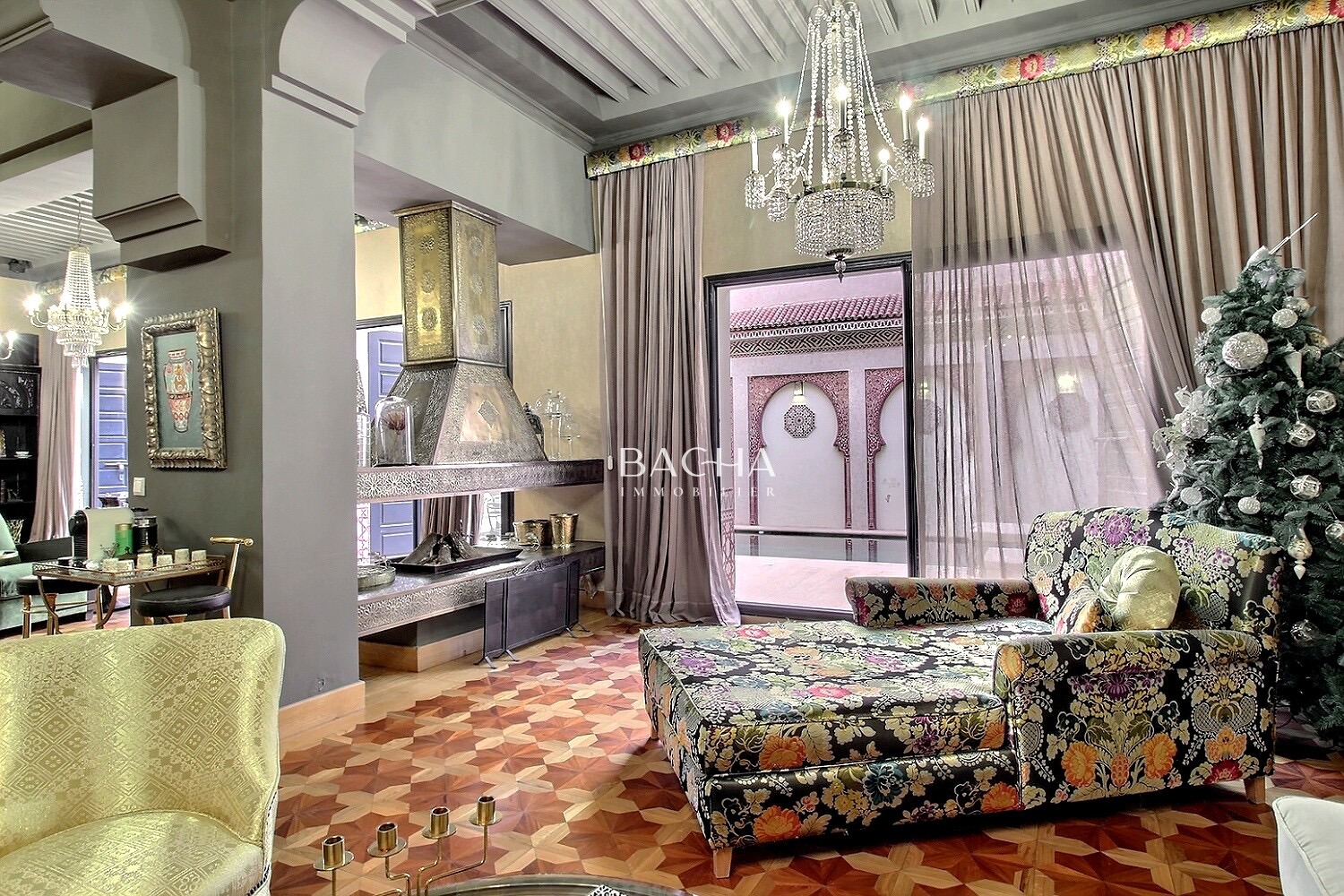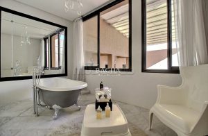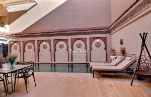 D’une surface au sol de 335 m2 et d’une superficie de 700 m2 habitable, elle est composée d’une entrée ornée de Zellige vous menant directement à un très vaste séjour ou vous plongerez dans l’univers traditionnel marocain. Un agréable coin cheminé vous attend pour les soirées d’hiver ainsi qu’un coin salle à manger et salon tv. Cuisine indépendante. Le séjour donne sur le patio équipé d’un toit ouvrant électrique vous offrant la possibilité d’illuminer la propriété. Une piscine chauffée est à votre disposition. 6 chambres dont une master bedroom. 2 chambres avec wc pour le personnel. Un étage est dédié à la relaxation, sauna, hammam, douche et salle de massage. Le toit sur 2 niveaux vous offre une vue panoramique sur Marrakech ou la chaine des montagnes de l’Atlas se déploie face à vous. La Koutoubia fait également partie du décor. Vue dégagée sans aucun vis à vis.